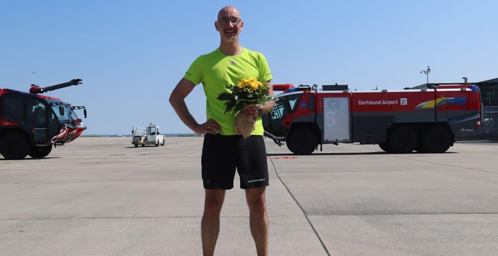 Zusammen bestritten sie am Dienstagvormittag den letzten Lauf der Dortmund-Aktion: Los ging es in der Nähe des General Aviation Terminals, entlang des Zaunbegleitwegs – bevor die drei Männer schließlich auf dem Vorfeld ins Ziel liefen. Dort hatte die Feuerwehr extra ein Zielband zwischen zwei Löschfahrzeugen gespannt. Von der kostenlosen Besucherterrasse aus konnten Gäste des Airports den Zieleinlauf ebenfalls beobachten. Zur Feier des Tages konnte sich Martin Rauscher neben zahlreichen Gratulationen auch über einen Blumenstrauß vom Dortmund Airport freuen.